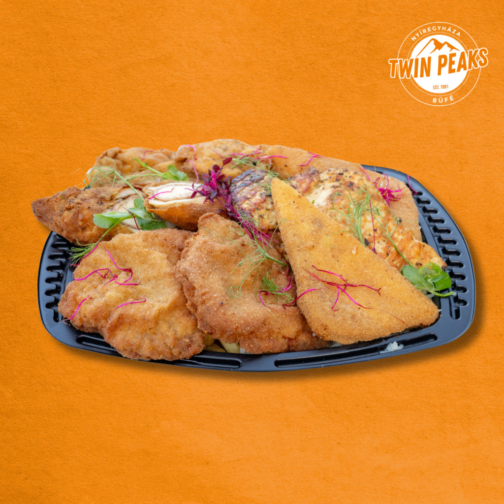 A 4 személyes tál a bőség és a változatosság tökéletes kombinációja. Alapként 60 dkg rizs és ugyanennyi ropogós hasábburgonya érkezik, amelyekhez mindenből dupla adag társul. Négy szelet aranybarnára rántott csirkemell, négy szelet omlós natúr csirkemell és négy szelet szaftos rántott karaj gondoskodik a húsimádók kedvéről. Emellett négy darab cordon bleu és négy szelet ropogós rántott sajt teszi teljessé a tálat. Ez az összeállítás bőséges, laktató és megosztásra született – ideális választás barátoknak, családnak vagy bármilyen társaságnak, ahol a jó étel központi szerepet kap.